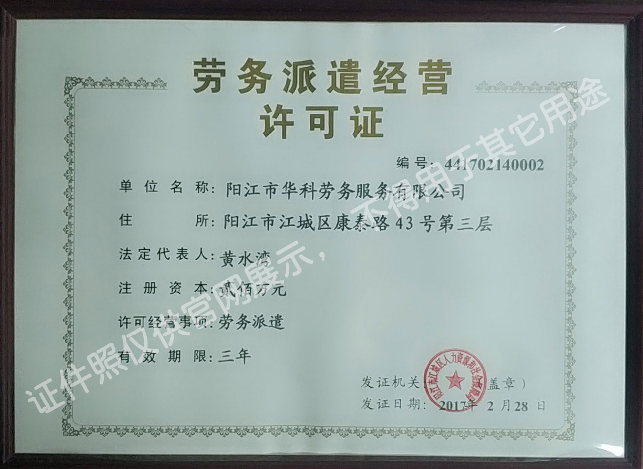 陽(yáng)江市華科勞務(wù)服務(wù)有限公司是專(zhuān)業(yè)從事勞務(wù)外包、人事代理、勞務(wù)租賃、人力派遣及管理的綜合性服務(wù)機(jī)構(gòu),是首批獲得廣東省人力資源廳、陽(yáng)江市勞動(dòng)和社會(huì)保障局頒發(fā)人力資源許可證的合法單位。“誠(chéng)信務(wù)實(shí)、專(zhuān)業(yè)熱情、滿(mǎn)意第一、服務(wù)社群”的經(jīng)營(yíng)理念,在勞務(wù)派遣業(yè)務(wù)的基礎(chǔ)上,更致力于合同制工人(臨時(shí)工、實(shí)習(xí)生、假期工)方向發(fā)展,為用工企業(yè)及時(shí)輸送合格的各類(lèi)人才,合理調(diào)配人力資源的有序流動(dòng),幫助求職者尋求更加滿(mǎn)意的就業(yè)渠道和崗位,切實(shí)維護(hù)求職者的合法權(quán)益。